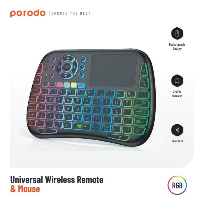 اگر به دنبال یک ابزار هوشمند و جمعوجور برای کنترل تلویزیون هوشمند، لپتاپ، اندروید باکس یا کنسول بازی خود هستید، کیبورد و موس وایرلس پورودو (Porodo Universal Remote Keyboard & Mouse) دقیقاً همان چیزی است که نیاز دارید!