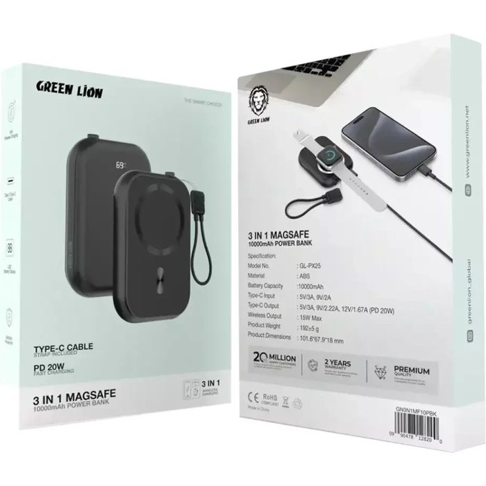 اگر به دنبال یک پاوربانک قدرتمند، سبک و چندکاره هستید، پاوربانک Green Lion 3in1 MagSafe 10000mAh بهترین انتخاب شماست. این محصول با طراحی هوشمند و فناوری مگسیف، امکان شارژ سریع و بیسیم دستگاههای مختلف را در هر شرایطی فراهم میکند.